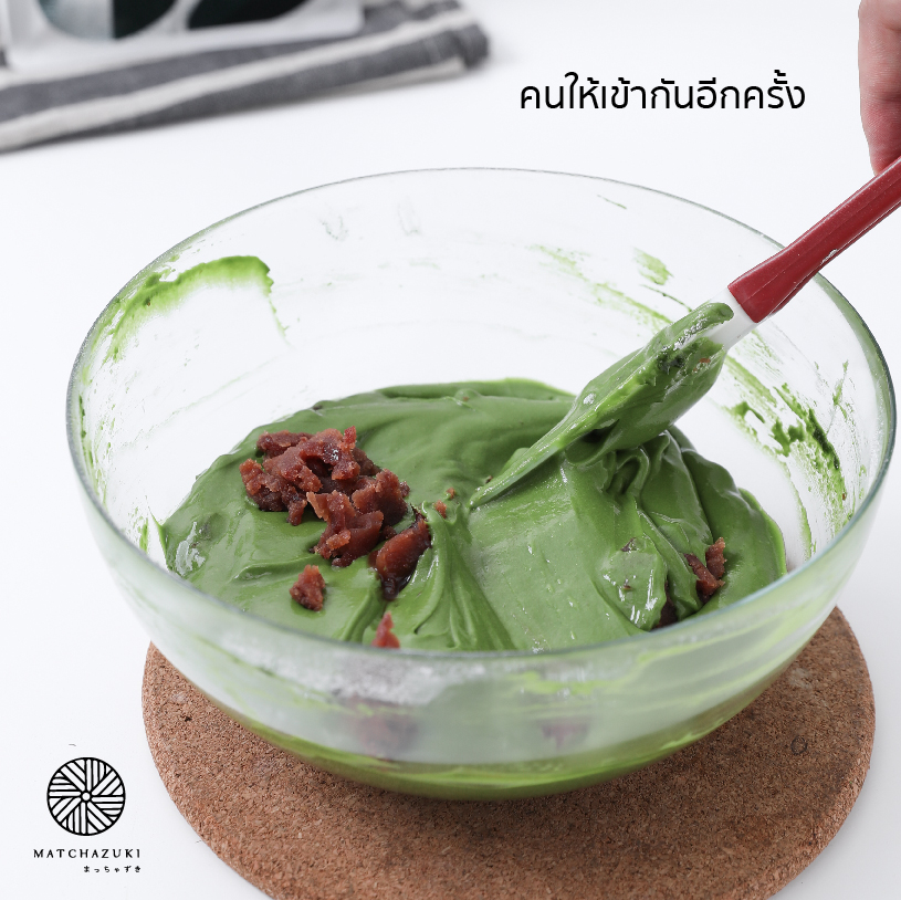 - ใส่ผงมัทฉะ เกรด Excellent ในไวท์ช็อกโกแลตที่ละลายแล้ว ผสมให้เนื้อเข้ากันเป็นสีเขียวเข้ม