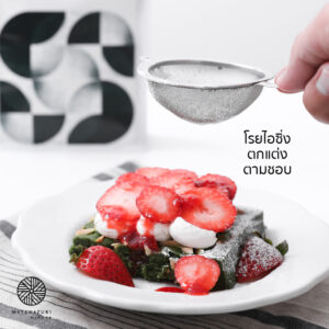 - ตกแต่งด้วยวิปปิ้งครีม ท็อปด้วยสตรอว์เบอร์รี่สดฝานเป็นแว่น จากนั้นโรยด้วยน้ำตาลไอซิ่งตามชอบ