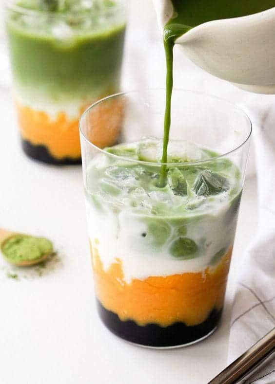 เริ่มที่ ชาเขียวมะม่วงไข่มุก ที่ได้ความหวานจากน้ำตาลบราวน์ชูการ์ที่เคลือบไข่มุก และจากมะม่วงสุกแทนการใส่ไซรัป ส่วนตัวไข่มุกสามารถหาซื้อแบบสำเร็จ หรือใครจะใช้ไข่มุกแบบมาต้มเองก็สามารถทำได้เช่นกัน เราจะใส่ไข่มุกไว้ชั้นล่างสุดของแก้ว ตามด้วยมะม่วงเพียวเร่ ½ ถ้วย เติมน้ำแข็งจนเต็มแก้วและเทนม ½ ถ้วย ลงไปเป็นชั้นที่ 3 หลังจากนั้นให้ชงมัทฉะในถ้วยชงชาอีกใบจากผงมัทฉะ 1 ช้อนชา กับน้ำ ¼ ถ้วย ตีด้วยฉะเซ็นให้เข้ากัน แล้วเทชาเขียวที่ตีลงบนแก้วที่เตรียมไว้เมื่อสักครู่ เป็นอันเรียบร้อย
