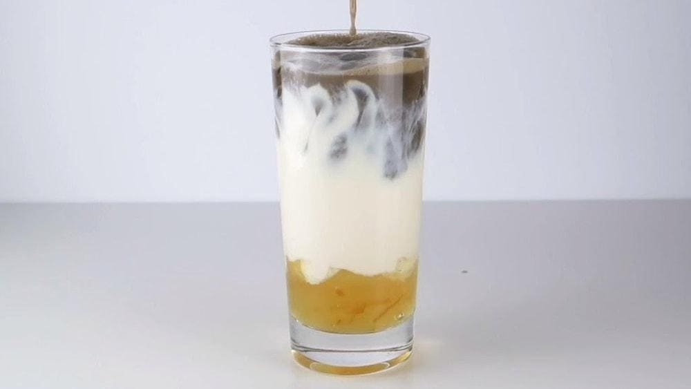 สูตรนี้เราจะใส่เป็น yuzu marmalade ลงไปชั้นล่างสุด 2 ช้อนโต๊ะ ตามด้วยน้ำแข็ง ½ ถ้วย แล้วค่อยๆเทนมลงไป 200 ml. หลังจากนั้นตีผงชาโฮจิฉะ 2 ช้อนชา กับ น้ำร้อน 100 ml. ให้ละลายเข้ากันเข้ากัน แล้วเทบนสุดจะได้เป็น 3 layer สวยงามตามภาพ